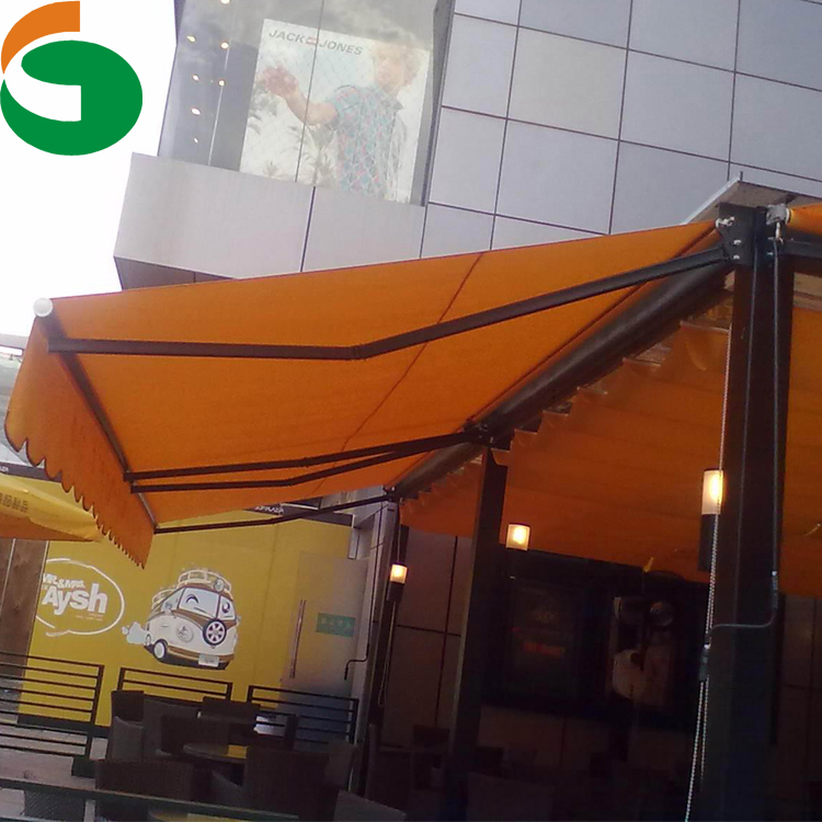 商业用品:系统利用电机带动铝合金卷管转动,使卷绕在卷管上的面料上升、下降。同时靠手臂支撑杆内的弹簧作用力将面料绷紧。该系统最大开启角度为0~130度,可通过开关、遥控、风光控等多种控制方式操作。